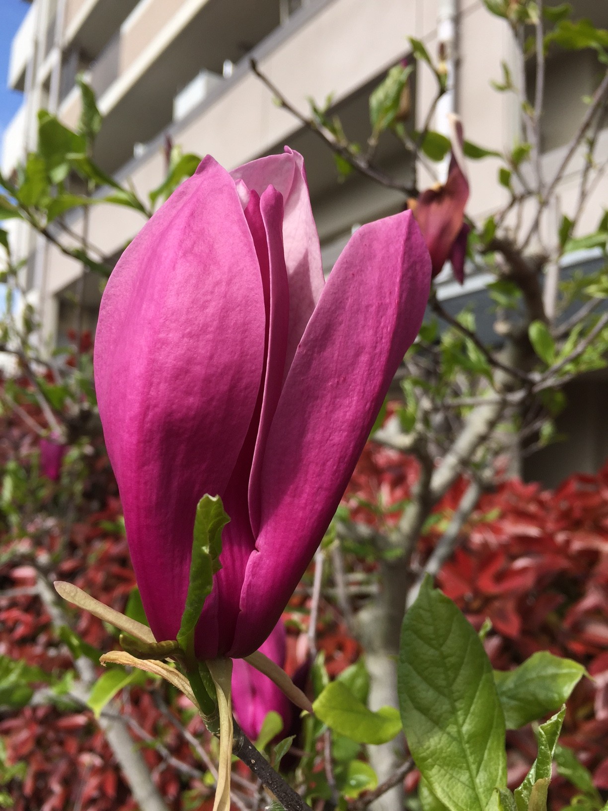 木蓮(写真は紫木蓮)、「ご飯~っ!」って叫んでるヒナ鳥の様ですが。小春日和で気持ち良さ気。